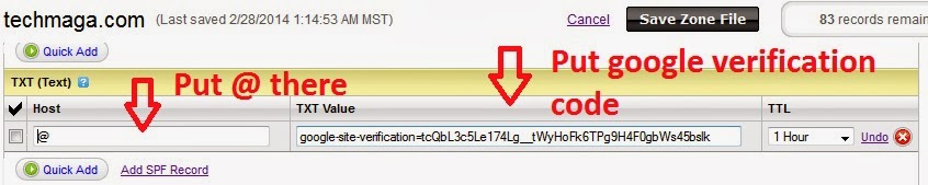 Click on the save zone file above it to save. Now scroll down to where you have your TXT(Text) and click on the quick add button. On the host field, put @ and on the pointing to field, Copy and paste the code you saved initially on a notepad there. If you have done this correctly, then you should be having something close to this: